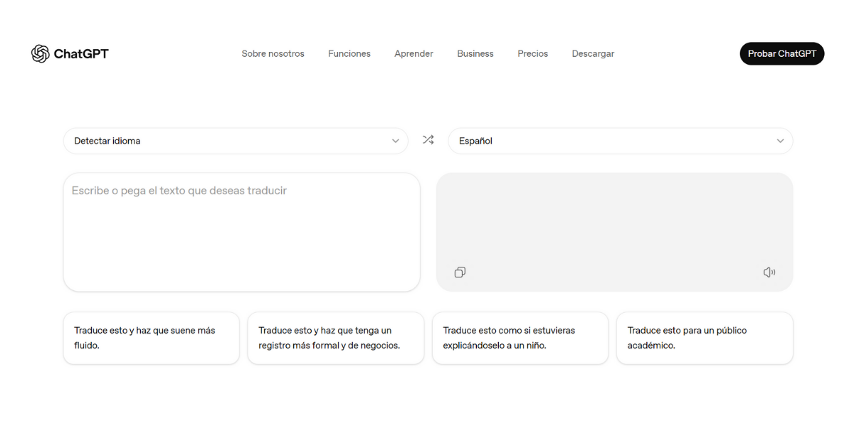 La interfaz de ChatGPT Translate es sencilla y familiar, con dos paneles de texto lado a lado al estilo de otros traductores en línea. En el panel izquierdo se ingresa el texto original (con detección automática del idioma) y en el panel derecho aparece la traducción al idioma de destino. La plataforma incluye funciones básicas como copiar el texto traducido con un botón o escucharlo en voz alta mediante un icono de audio.